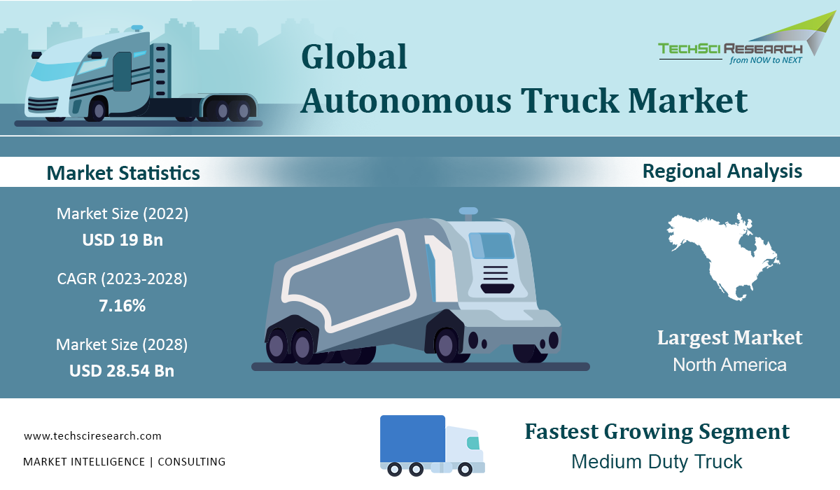 The global Autonomous Truck Market has emerged as a disruptive force, revolutionizing the transportation and logistics industry with its cutting-edge technology and promising prospects. With a valuation of USD 19 billion in 2022 and a projected robust growth rate of 7.16% through 2028, this market segment is poised for unprecedented expansion.